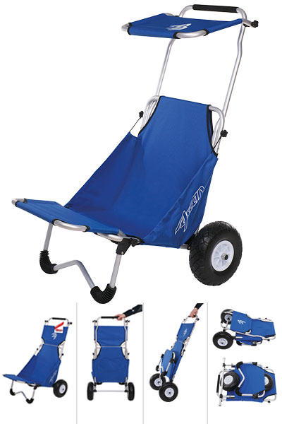 mit breiten Rädern für den Transport von Sport- und Freizeitzubehör. Zuladung 50 Kg, als Sitz 100 kg.